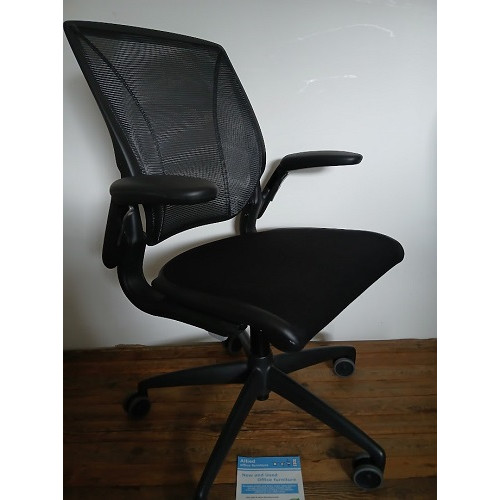 Upgrade your workplace with the Humanscale Diffrient World Chair, designed for effortless economic support and modern style. This chair features a breathable black mesh back paired with a comfortable black fabric seat, combining air flow with cushioned seating for long lasting comfort. It’s minimalist design and automatic recline system adapt to your movements naturally, reducing strain and promoting healthy posture throughout the day.