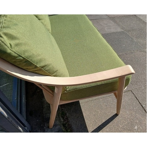 The sofa features Ercol’s signature steam-bent solid ash wood frame, with elegant curved arms and distinctive spindle detailing, giving it a light, mid-century inspired look.