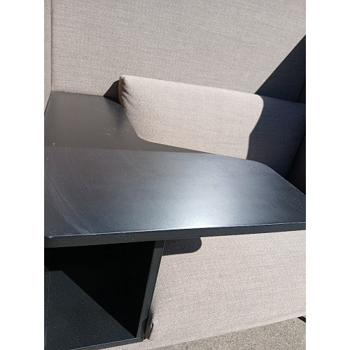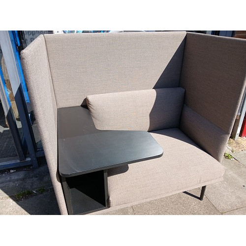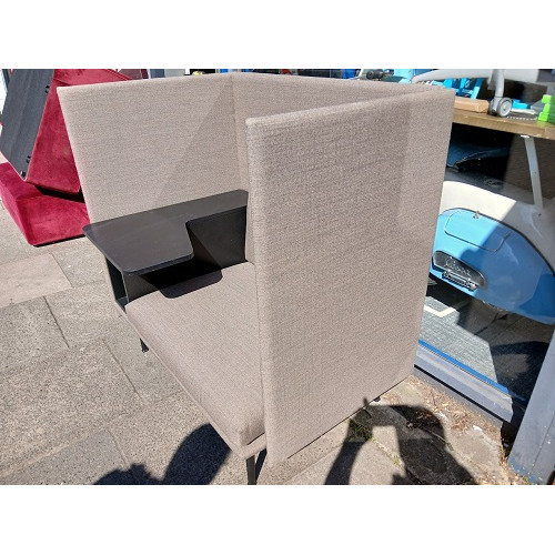 Features a high-back upholstered surround for acoustic shielding and visual privacy, deep cushioned seating for comfort, and an integrated desk surface perfect for laptop work, calls, or quiet tasks.